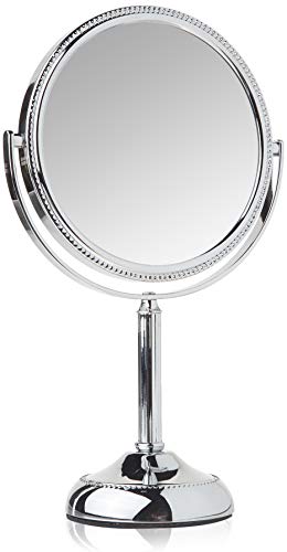 The JP910CB is Jerdon’s take on a budget makeup mirror and it is a successful attempt. While the quality and assembly of the mirror isn’t the best (a bit flimsy, especially on the swivel), it still offers everything you need from a simple makeup mirror. It stands at 11” of height and the double-sided mirror has a 6” diameter, offering 1x and 10x magnification. It features a pretty beaded finish around the mirror face and the mirror itself is available in 3 different finishes – bronze, chrome and nickel. A good mirror coupled with an even better price-tag.