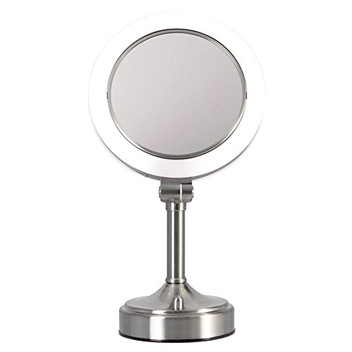 Classic Conair quality with a touch of modern, their new 3-way touch makeup mirror is a great piece at an even better price. The 8.5” mirror face is double-sided and double-lighted, offering 1x and 8x magnification for maximum versatility. It’s a big mirror, not only is the face large but the mirror stands at 17.5” of height so you won’t have to use an additional base. It’s solidly built and sturdy while maintaining a smooth-turning 360º swivel. While it still uses a regular incandescent bulb, it gives you the option to turn it on low, medium or high lighting potency by simply touching the mirror’s base. It’s available in 2 different finishes, satin nickel and matte black so you can pick whichever suits your surroundings the best. The Conair 3-way touch is a large and good quality lighted makeup mirror that is sure to satisfy.